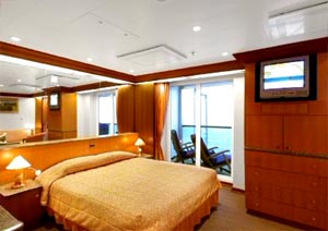 Balcony, two lower beds that can convert to queen size. Direct dial, ship-to-shore telephone service, television, hair dryer, safe deposit box and mini-bar in every stateroom.